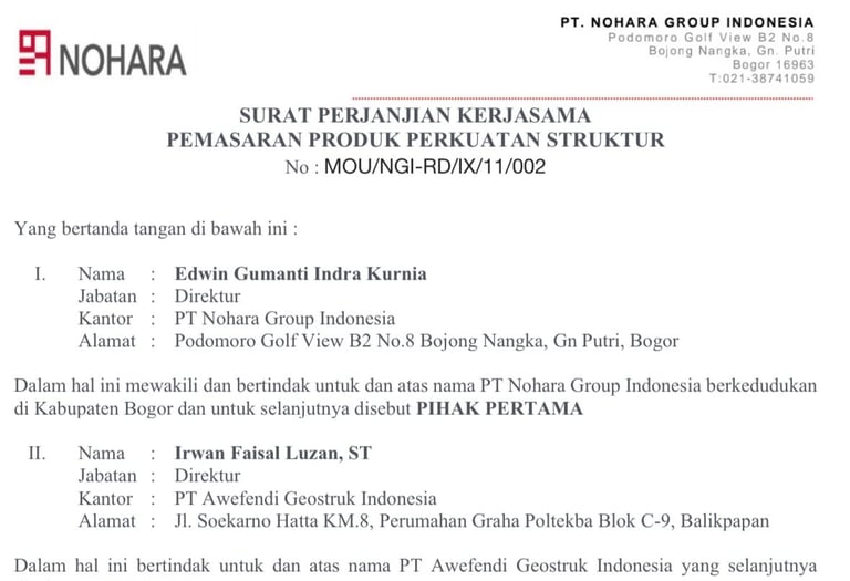 Penandatanganan Kontrak Kerjasama-2025 merupakan momen penting bagi PT. AWEfendi Geostruk Indonesia untuk secara resmi menjalin kemitraan strategis dengan berbagai pihak. Acara ini menandai dimulainya kolaborasi baru yang bertujuan untuk memperluas jangkauan layanan geostruktural perusahaan, meningkatkan inovasi, dan memperkuat posisi di industri. Melalui kontrak ini, PT. AWEfendi Geostruk Indonesia berkomitmen untuk memberikan solusi terbaik dan berkontribusi pada kesuksesan proyek bersama di masa depan.